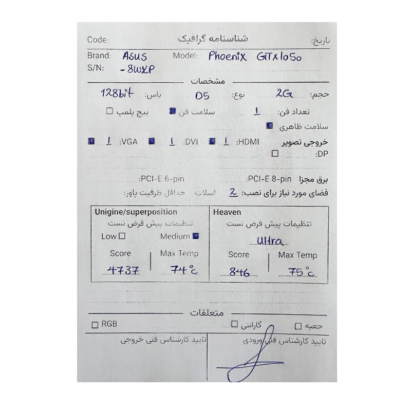 کارت گرافیک ایسوس ASUS Phoenix GeForce GTX 1050 2G دارای پردازنده GeForce GTX 1050 شرکت انویدیا (Nvidia) می باشد. فرکانس اصلی این مدل نسبت به مدل رفرنس مقداری اورکلاک کارخانه شده است و به 1354 مگاهرتز رسیده است. این مدل کارت گرافیگ دارای 2 گیگابایت حافظه گرافیکی از نوع GDDR5 و رابط 128Bit است. فرکانس موثر حافظه 7008 مگاهرتز است. همچنین دارای 3 خروجی تصویر شامل یک DVI-D ، یک HDMI 2.0b و یک Display Port است. لازم بهذکر است که این کارتگرافیک از 3 درگاه PCI Express 3.0 بهره میبرد حداقل پاور مورد نیاز 300 وات می باشد.