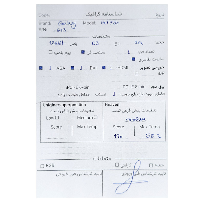 کارت گرافیک گالکسی Galaxy GT 730 2G DDR3 128BIT استوک