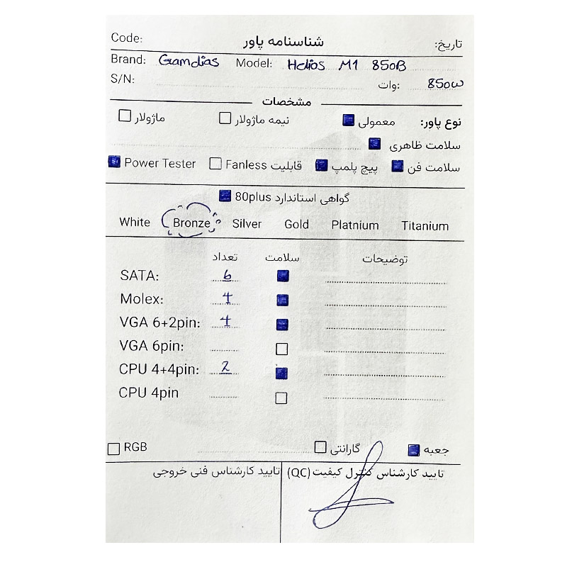 مشخصات پاور 850 وات گیم دیاس GAMDIAS Helios M1 850B :