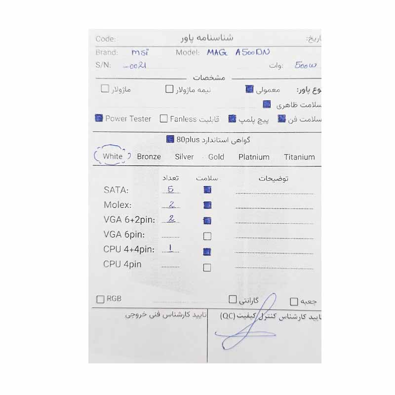 پاور ام اس آی MSI MAG A500DN 500W White استوک