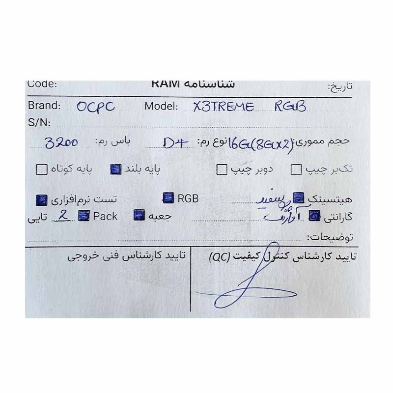پک رم OCPC X3TREME RGB 16GB (8GBx2) DDR4 3200Mhz استوک