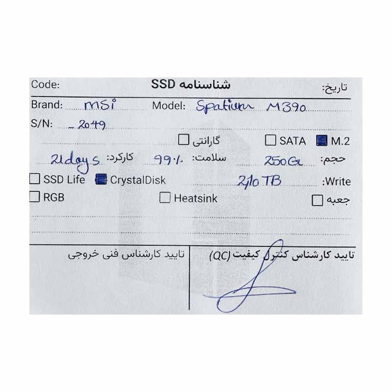 اس اس دی MSI M.2 NVME Spatium M390 250GB 99 استوک